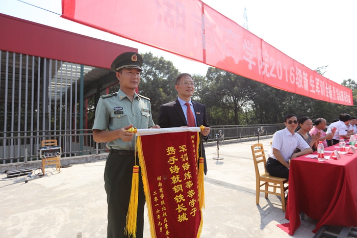 最后,党委书记唐亚阳向承担我校此次军训工作的部队官兵赠送锦旗,感谢他们辛勤的付出。