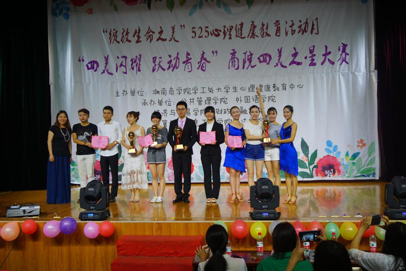 2016年6月6日晚,由我校学生工作处大学生心理健康教育中心主办,公共管理学院、经济与贸易学院、财政金融学院、外国语学院、设计艺术学院、法学院、国际教育学院、计算机与信息工程学院八院心育部联合承办的“四美闪耀,跃动青春” 商院生命四美之星决赛在大礼堂举行。本次比赛也为我校5.25心理健康活动月拉上帷幕。
