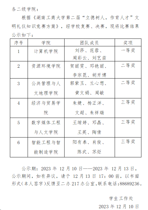 湖南工商大学第二届“立德树人,作育人才”文明礼仪知识竞赛结果公示